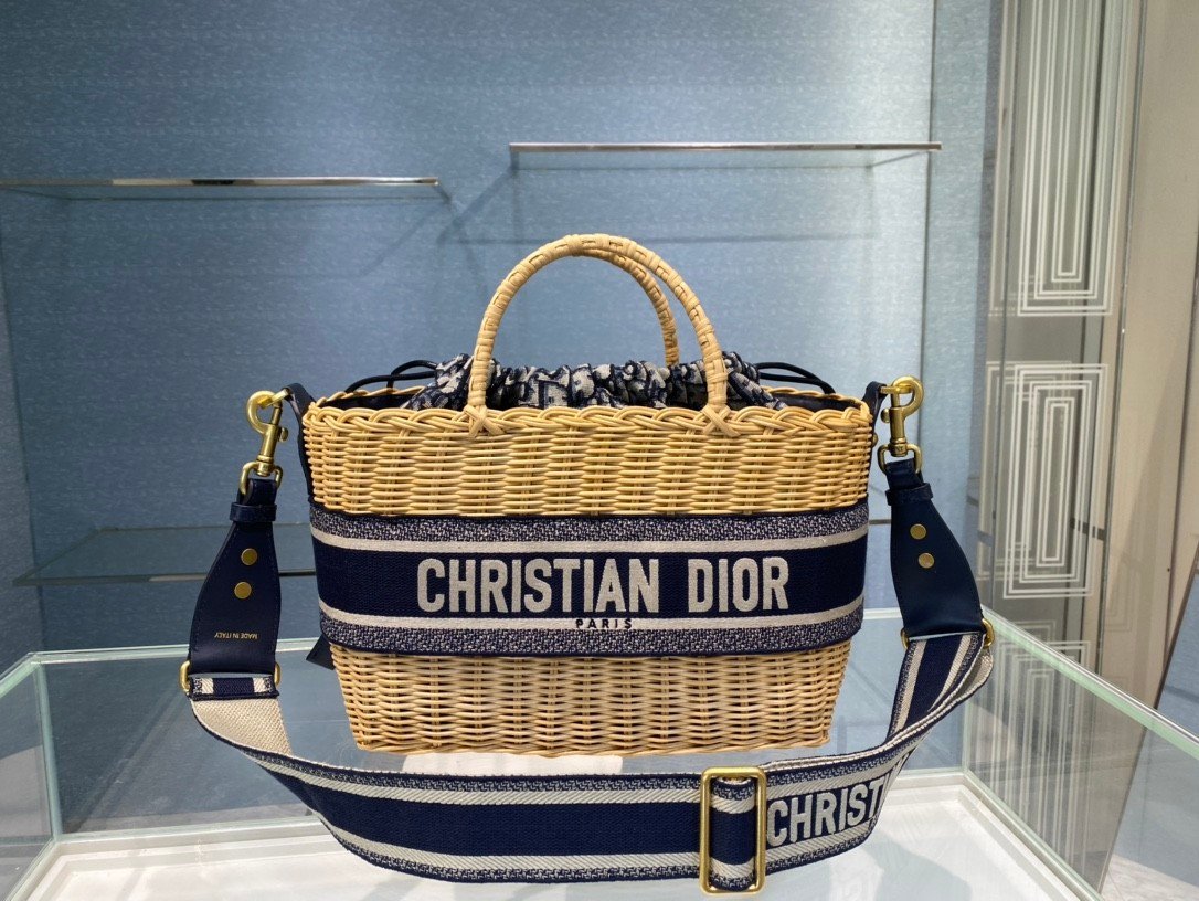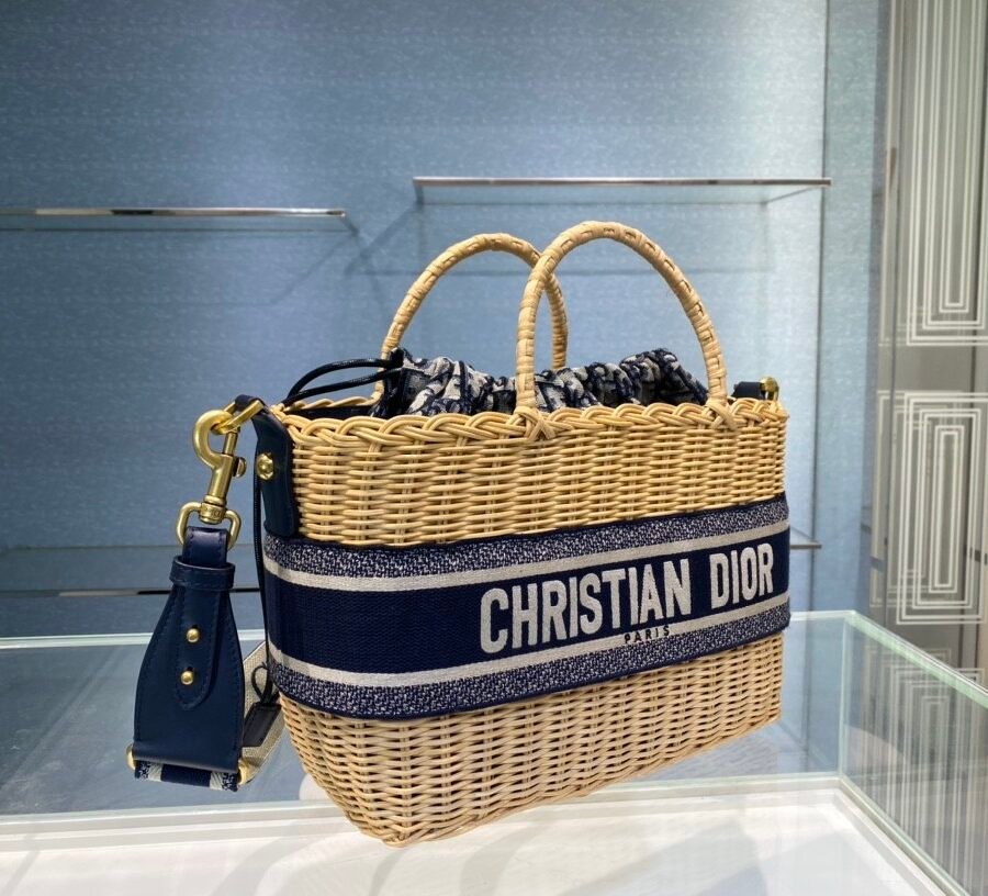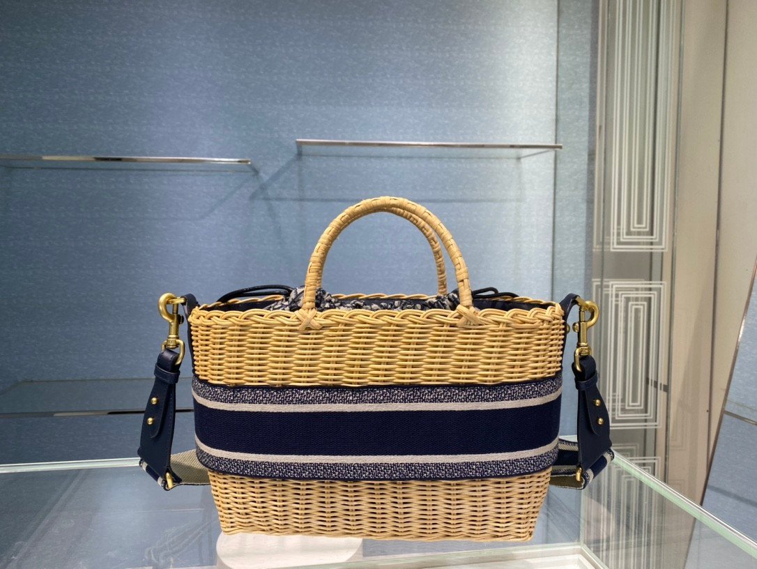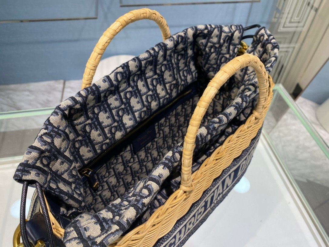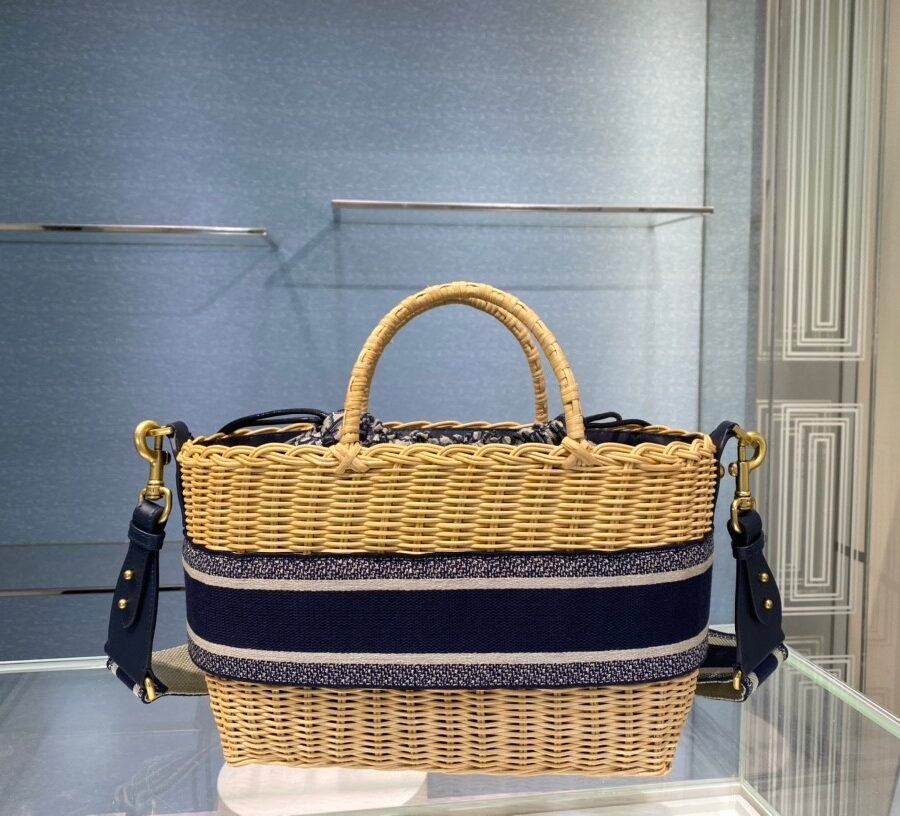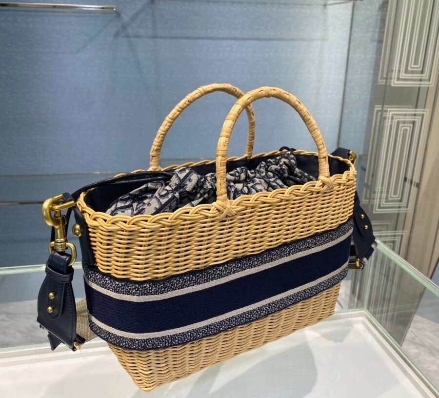 DIOR WICKER BASKET BAG in Blue Dior Oblique with Natural Wicker, Jacquard