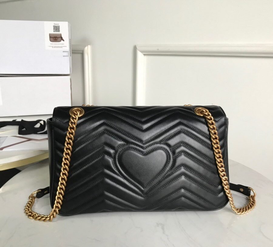 GG Marmont medium in Black with Chevron leather with heart, Antique gold-toned